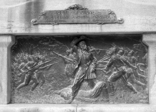 L’artiste a donc rappelé le geste héroïque de Pierre Auguste Anglade mais aussi le courage légendaire des turcos en représentant le sergent Abd el Kader ben Dekkish qui porte fièrement le drapeau du régiment qu’il contribua à sauver. L’artilleur blessé rappelle peut-être la batterie d’artillerie et celle de mitrailleuses qui se trouvaient en arrière du régiment et furent terriblement maltraitées, selon l’historique du 2ème RTA, par les canons Krupp de l’artillerie prussienne. Le mobile qui met en joue un adversaire serait un figeacois nommé Delpech. La Garde Nationale Mobile n’a pas participé à la bataille de Woerth. Sa présence se justifie par le fait que le monument a aussi été érigé à la mémoire des 187 enfants de l’arrondissement de Figeac morts pour la Patrie dont la liste figure, par canton et commune, sur les plaques de marbre fixées sur les faces latérales et arrière du socle du monument. Mais demeure une question qui justifia des courriers au ministère d’un parent de Pierre Auguste Anglade, d’un sénateur lotois et in fine du préfet du Lot quand le projet d’érection du monument se précisa. Le héros était il lieutenant, comme l’indique l’historique, ou capitaine ? La réponse se trouve dans le dossier de cet officier où l’on trouve, outre les correspondances précitées, la minute de l’acte de sa nomination au grade de capitaine par décret du 4 août 1870. Cette nomination ne pouvait être connue le 6 août ni du chef de corps ni de l’intéressé. Sans doute ne l’était elle pas non plus du rédacteur de l’historique. Si Pierre Auguste Anglade est mort avec les galons de lieutenant, il était donc bien Capitaine. Une légende (4) veut que des brancardiers allemands aient relevé sur les lieux des derniers combats du 2ème RTA le corps d’un capitaine, donné pour Anglade, tenant dans sa main une lettre de sa fille Marguerite. Ce point est douteux. D’une part aucune trace de cet enfant ne figure dans son dossier, d’autre part Anglade portait le 6 août des galons de lieutenant. Observons toutefois que la mère du Capitaine Anglade s’appelait aussi Marguerite…… Rappelons enfin, en guise de conclusion, que le Capitaine Anglade a été enterré dans une fosse commune avec ses hommes, à l’endroit même où il mourut. La croix qui fut érigée après la guerre de 1870 porte la mention :