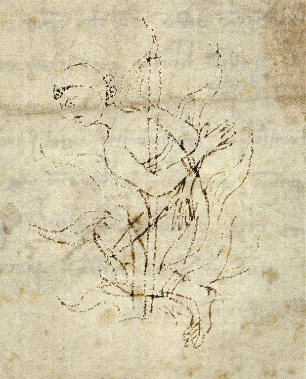 Milieu du XIIIè s. : Dessin d'un hérétique livré aux flammes (au recto, projet de bulle du pape Innocent IV sur les poursuites contre les hérétiques). Cote A.N. : AE/II/257