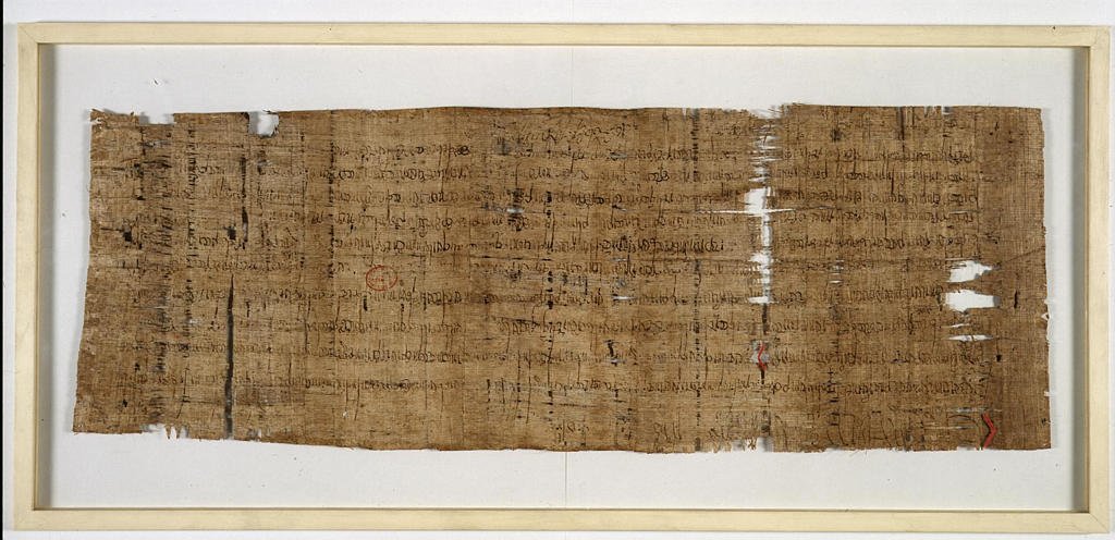 628 : Partage ratifié par Dagobert pour des terres en Rouergue (papyrus) - Cote A.N. : AE/II/3.